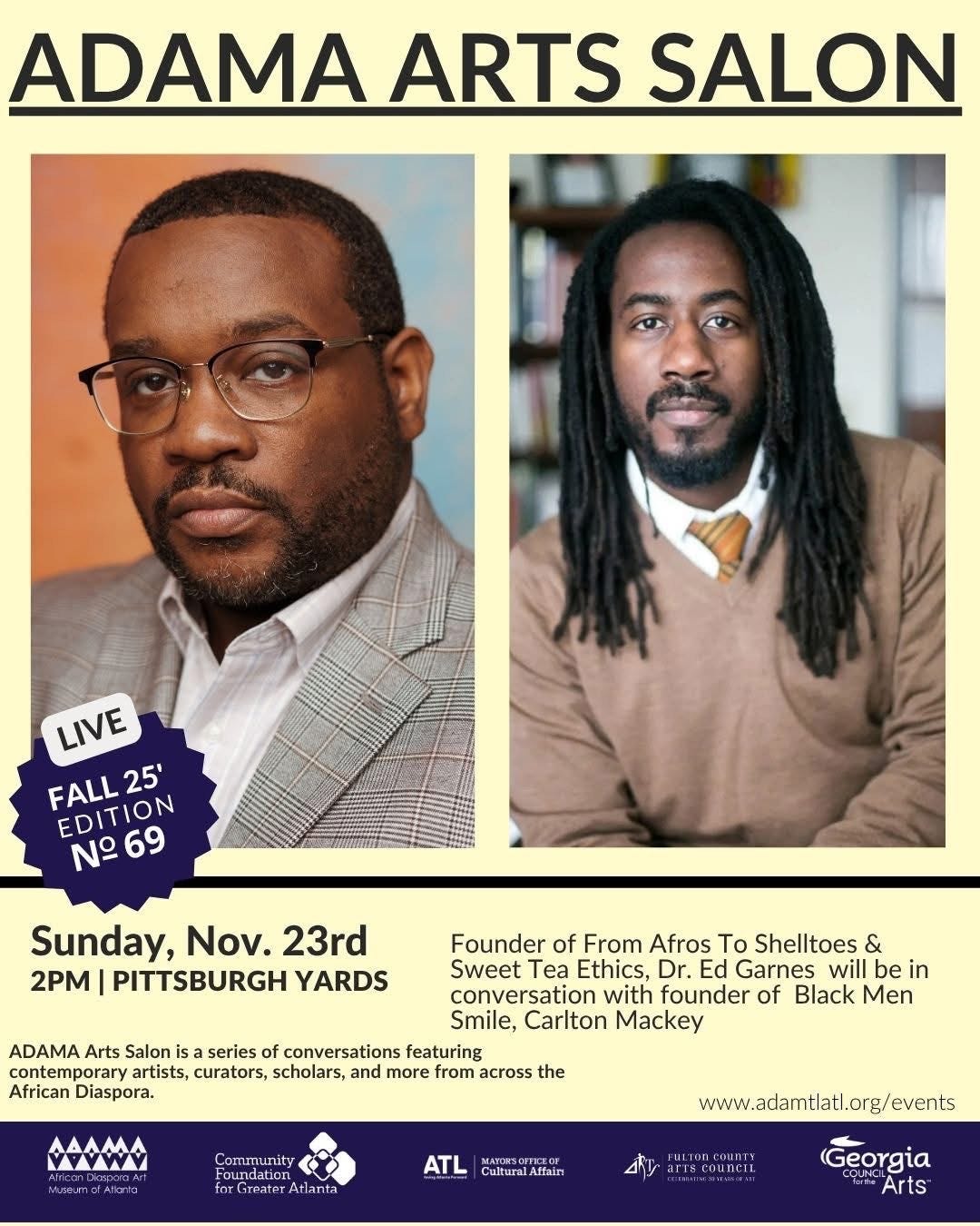 Sunday, Nov. 23rd 2pm-3pm/ ADAMA Arts Salon Episode 69 Founder of From Afros To Shelltoes & Sweet Tea Ethics, Dr. Ed Garnes will be in conversation with founder of Black Men Smile, Carlton Mackey.